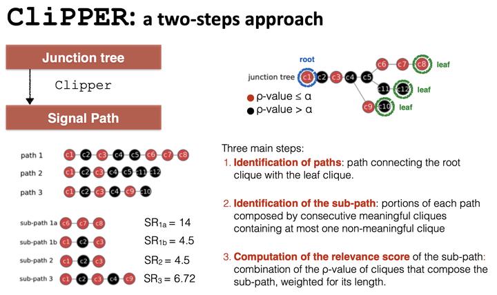 Implements topological gene set analysis using a two-step empirical approach. It exploits graph decomposition theory to create a junction tree and reconstruct the most relevant signal path. In the first step clipper selects significant pathways according to statistical tests on the means and the concentration matrices of the graphs derived from pathway topologies. Then, it “clips” the whole pathway identifying the signal paths having the greatest association with a specific phenotype.